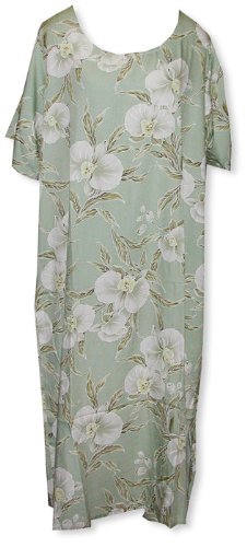 Round Neck Long Dress - White Orchid Hawaiian Aloha Caftan/Kaftan Style Evening Dress in Green - 2X Plus