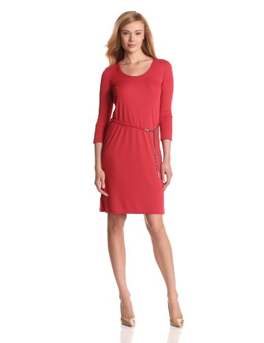3/4 sleeve luxe jersey t-shirt dress with a braided belt and hanging chain closure