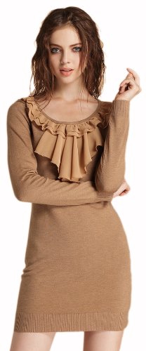 Chendvol Retro Flouncing Patchwork Wool Acrylic Dress for Women (Medium, Coffee)