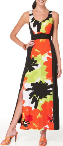 A long flowing maxi dress by London Times features a large floral abstract print down the center bordered by solid black panels at the sides. Two slits at the front measuring 18 inches. Fabric belt is included. Polyester/Spandex.