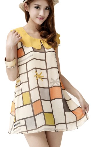 Chendvol Semi-sheer Tartan Flared Hem Petal Neck Dress for Women (Medium, Yellow)
