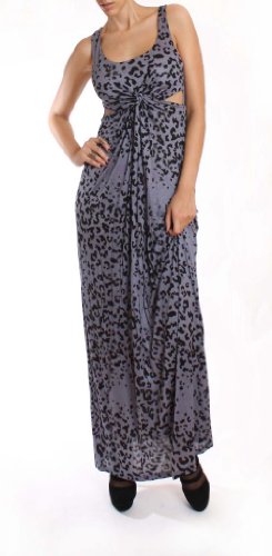 - KNIW MAXI DRESS WITH GREAY AND BLACK LEOPARD CHEETAH PRINT DESIGN. FEATURES TWISTED FRONT AND CUT OUT SIDES. 45% POLYESTER. 46% RAYON AND 8 % SPANDEX. MACHINE WASH COLD. LAY FLAT TO DRY. DO NOT BLEACH.