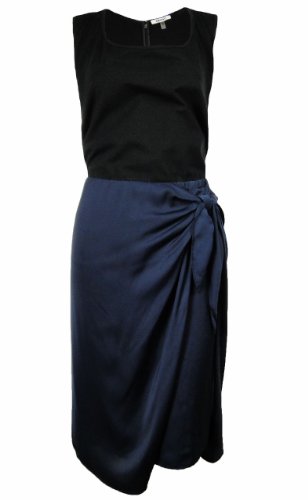Perfect for a date night! This DKNYC Woman Sleeveless Sarong Dress features darted bust, no lining, cotton stretch upper, charmeuse lower, concealed back zipper, hook and eye closure, sleeveless, faux wrap tie front skirt, and scoop neck. Upper section: 92% Cotton, 8% Elastane. Lower Section: 100% Polyester. Dry clean. Made in China.