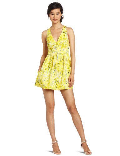 Feminine and classic. This halter dress contains criss-crossed staps in back and a low v-neck front. This yellow multi-colored dress is perfect for summer and will add a bright pop of color to any wardrobe.