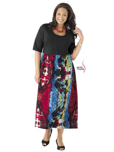 Our Gently Shaped Collection offers new options designed to complement your womanly proportions. We flatter your curves with beautiful styles created to follow your figure's contours. Knit and woven elements meet in this colorful look. Solid knit banded bodice with round neckline and short sleeves, over a multi-color print woven skirt. Shaped A-line fit. 97% cotton/3% spandex top, 100% polyester skirt. Machine wash. Imported. Length: 50".