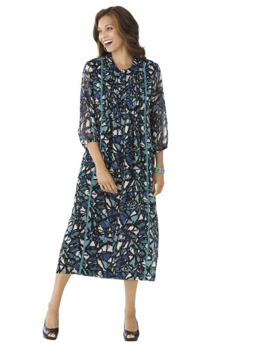Heavenly shades of blue and aqua sparkle in a contemporary stained glass design. Vertical rows of crochet work create a figure-flattering lengthening effect. Round neckline, tucking at the empire bodice releases to easy fullness below. Button half placket. 3/4 sheer sleeves edged in baby elastic. A-line fit. 100% woven polyester with solid lining. Machine wash. Imported. Length: 48".