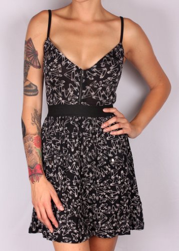 From the new Abbey Dawn clothing range by Avril Lavigne, the Abbey Dawn Safety Dance dress is a black, all-cotton ultra-fine fabric, with a grey safety pin all over design. This mini dress has two small pyramid stud fastening pockets on the front. There is a gun metal grey zip on the bust to add a steamy element to your look. The straps are adjustable and also made from ultra soft and comfortable material. To give this Abbey Dawn dress a great look and snug fit, the waist band is elastic and the back panel is smocked elastic. This cute dress has a punky edge which the Abbey Dawn collection does so well.