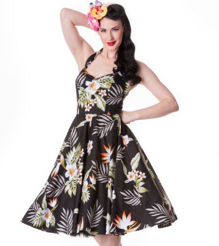 This gorgeous Hell Bunny 50's dress has a beautiful tropical floral pattern on a black dress. This halterneck dress comes in 4 other colours, red, pink, blue and yellow. The bodice is fitted and the back has an elasticated smocked panel either side of the zip to give a perfectly shug fit. The skirt is a full circle which looks great with a 25" petticoat (not included). The main features of the Hell Bunny Black Alika Dress include;