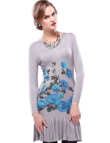 Maxchic Cotton-Blend V-Neck Long Sleeve Pleated Swing Hem Printed Knit Sweater Dress Q42005S11M,light-grey,Medium