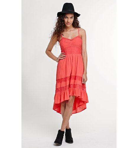 Roxy juniors "night shine" woven and lace tank dress with hi/lo hem and fully lined. 47" hps.