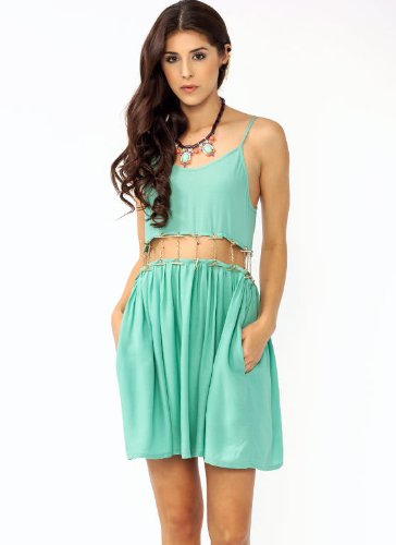 This partially lined, non-stretchy dress has chain link toggle accents. This dress has two side pockets, adjustable straps, and this dress doesn't include any closures. Model is wearing a small. All measurements are for a small. Length from shoulder to hem (longest adjustment): 34 inches. 100% Cotton. Hand wash cold, hang dry. Imported.