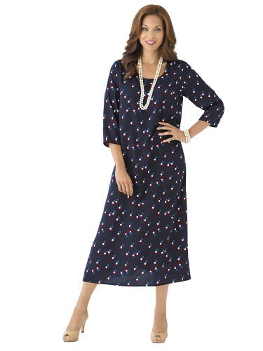 A fresh spin on polka dots combines red, white and blue. Figure-lengthening vertical silhouette has a round neckline. 3/4 sleeves. Pullover with button-and-loop closure at back of neck. Relaxed fit. 100% woven polyester. Machine wash. Imported. Length: 48".