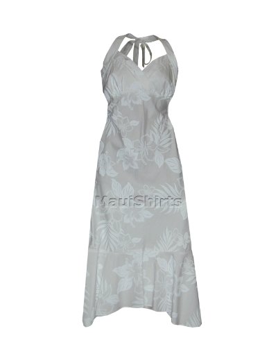 Halter Sundress - Women's Elegant Tropical White Empire Hawaiian Aloha Tea Length Sun Dress in Wedding White - L