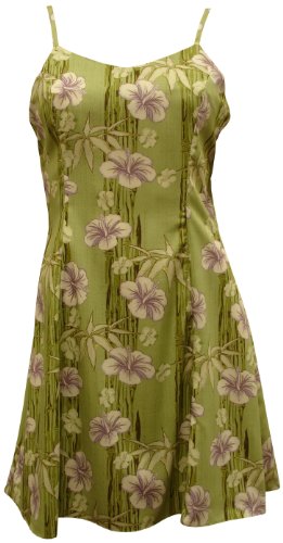 Mini Sundress - Women's Hibiscus Bamboo Panel Spaghetti Strap A Line Hawaiian Aloha Princess Seam Ryaon Sun Dress in Green Tea - S