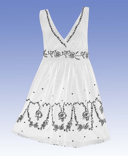 Sweet summer sundress. Capture the style of yesteryear with this fun floral embroidered surplice neckline dress. Pair with a cardigan or a wrap for a day to evening effect. Fully lined. Has 3 1/2" defined waist band. The "v" neck is in the back as well as the front. Contrast embroidery is only in the front. Material: 100% Cotton. Origin: Made in India. Cleaning:Machine wash.