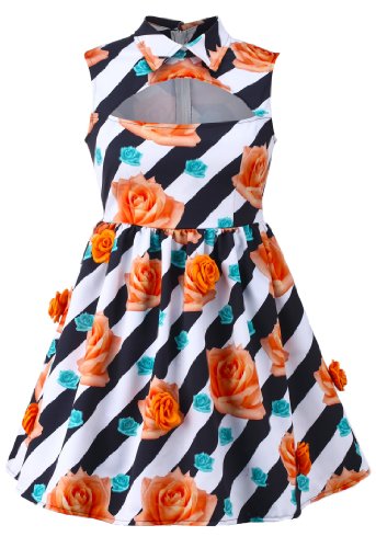 Dress,featuring na black and white strips polyester fabric, big orange roses and small blue orange roses print details, a stand collar and sleeveless style, cut off front detail, a cencealed rear zipper fastening, middle length and nice stitching. Cut in a regular fit. S: Shoulder width:34cm Length:82cm Bust:80cm Waist:70cm M: Shoulder width:35cm Length:83cm Bust:84cm Waist:74cm All ROMWE's fashions is for street snap fashion. ROMWE is a global street fashion brand featuring the best street style from cities like New York, Berlin, Paris, London, Tokyo, Shanghai, Hong Kong, Milan and more. ROMWE is your source to find the hottest street style