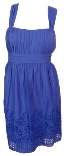S.L. Fashions casual sun dress features full lining, concealed back zipper, hook & eye closure, sleeveless, pleated waistband, pleated bust, A-line silhouette, eyelet embroidered border hem, and 100% cotton fabric.