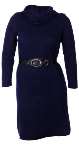This Nina Leonard straight smooth knit silhouette offers grace and elegance during those cool weather days. Features include: long sleeves, rolled cowl neck, fashion belt (included), and below the knee length.