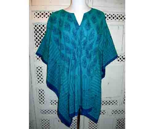 This 100% hand printed short cotton kaftan is made by Anokhi, India's foremost block print company. There is nothing more comfortable in hot weather than Anokhi's 100% cotton fine muslin printed fabric. Soft and cool, this kaftan will make you look great and feel wonderful at the same time, with its light weight and loose fit. It's perfect for wearing over pants or capri's, as a bathing suit coverup, or for sleepwear. Once you have one in your wardrobe, you will be back for more.