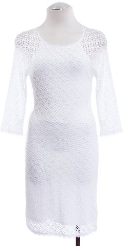This dress by Aqua in white features cotton stretch fabric, eyelet design with scalloped lace trim, round neckline, 3/4 sleeves, pullover style and is lined.