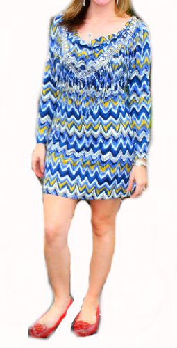 Joyous and Free Blue Zig-zag Print Tunic/dress with Fringe and Sequin Detail Around Collar (Medium)