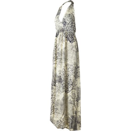 Quiksilver women's "coral fan halter dress" crinkle rayon hoffman print maxi dress with open back and tie halter details. 58" hps body length.