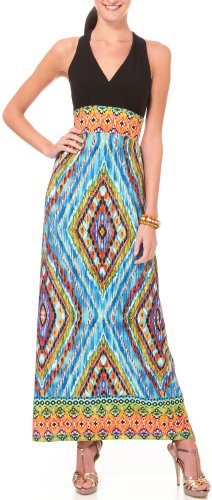 Maxi dress by Ronni Nicole offers an ikat print, a flattering surpliceneckline that flows into a racerback, empire waistline & comfortablestretch fit. Dress measures 56 inches from the high point of the shoulder. Polyester/Spandex.