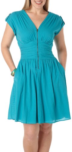 This finely striped dress by Rabbit Rabbit features an exposed zipperat the front, button tab sleeves, empire waistline with ruching, smocked at the back of the waist, plus it has pockets. 100% Cotton.