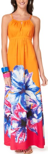 A long flowing maxi dress by Trulli features a halter neck style withkeyhole details & tie, empire waistline & a colorful floral border print. Polyester.