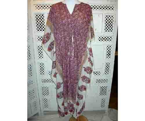 This 100% hand printed cotton kaftan is made by Anokhi, India's foremost block print company. There is nothing more comfortable in hot weather than Anokhi's 100% cotton fine muslin printed fabric. Soft and cool, this kaftan will make you look great and feel wonderful at the same time, with its light weight and loose fit. It's perfect for lounging around the house, for hosting parties, or for sleepwear. Once you have one in your wardrobe, you will be back for more.