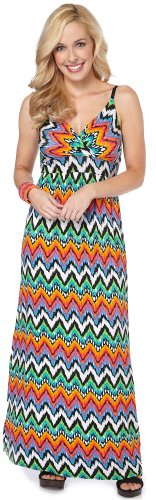 Fashion forward style provided by Allison Brittney is featured in thismaxi dress along with a surplice neckline, adjustable straps, non-removable soft cups, ties at the back & a zig zag pattern throughout. Spandex. Rayon.