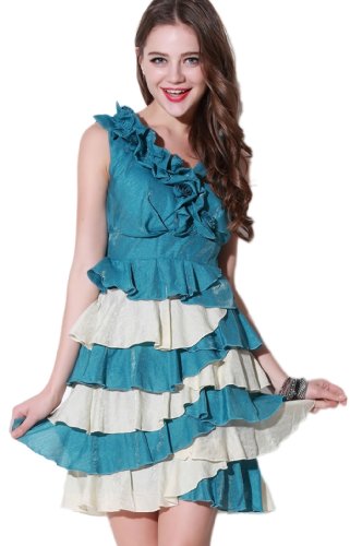 Chendvol Flouncing V Neck Overlayered Vest Dress for Women (Medium, Blue)