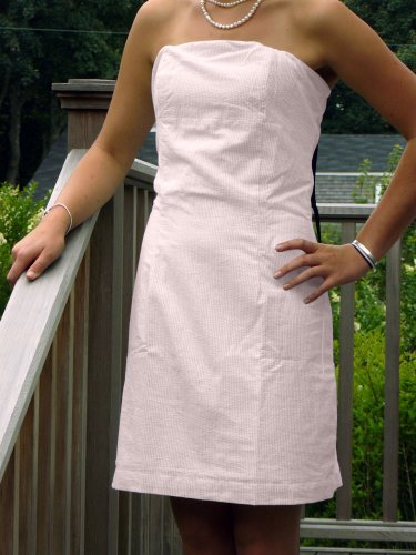 100% cotton pink seersucker strapless dress. Dress features a back zipper closure. Made from cool, classic seersucker fabric with a light cotton lining. Also available as a Seersucker Halter Dress