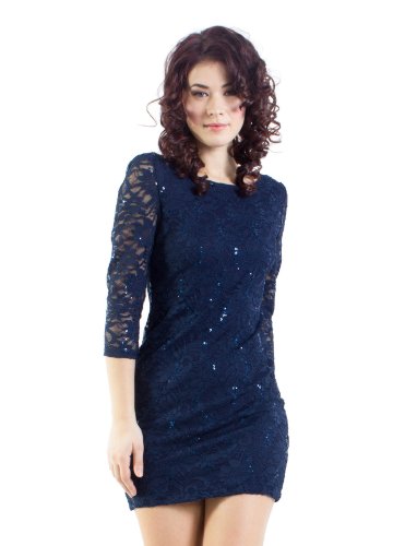 Quarter Sleeved Lace Sequined Dress with U-back (2, Navy)