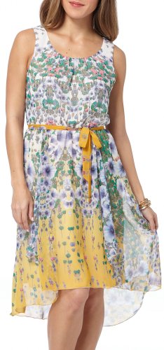 Effortlessly fashionable, this dress by Rabbit Rabbit features a pretty floral printed overlay. Coordinating waist sash adds a figure-flattering finishing touch. Cotton. Spandex. Polyester.