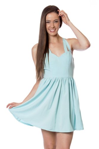Cotton/polyester fitted top flared bottom concealed side zipper criss cross back feature teal aqua colour model is 172cm and is wearing size 8. Please use our size guide to help determine your size of clothing.
