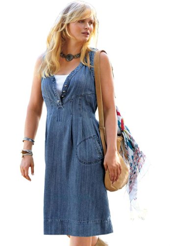 Shaped V-neckline gives way to a button placket ending at a shaped high empire waist seam. Stitched pleating at bust. Cotton/polyester. Machine wash. Imported. Shaped back waist seam with inset detail and stitched pleats, back ties Stitched welt pockets Approx. 42" Watch The Dress Fit Video Plus size dresses, casual dresses-Sleeveless Denim Dress by Taillissime, sizes 14W to 34W