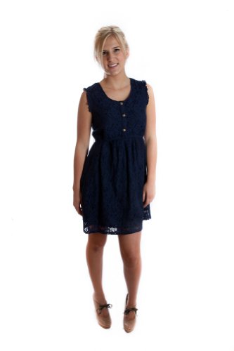 The Lace Empire Waist Dress by Tulle is another great vintage inspired modern dress. This dress features 4 snap buttons down the center of the dress that stop and the empire waistline. The dress also has a skinny tie belt that ties in the back giving you a more flexible fit. The sleeves are a short cap sleeve with lace ruffle trim around the edges. The dress hits our 5'7" model about 4 inches above the knee. The dress is also lined. Available in Navy. Fabric is 60% Cotton, 40% Polyester. Lining is 100% Polyester. Dry clean only. Made in China.