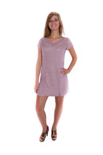 This stylish Short Sleeve Panel Dress by designer Tulle features lace panels down the center of the front and back of the dress as well as around the neckline for added detail. The dress features a sheer fabric and also features a tank dress underneath as the lining. The dress hits our 5'7" model several inches above the knee to give you an idea of length. Available in Rosedust (a mauve color). Fabric is 100% Polyester, Lining is 100% cotton. Made in China. Machine wash gentle cycle. Lay flat to dry or dry clean.