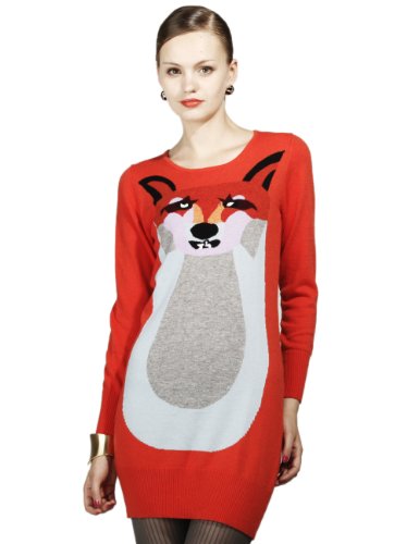 Maxchic Women's Crewneck Long Sleeve Cute Fox Print Wool-Cashmere Fine-knit Sweater Jumper Dress Q04316S12,Red,X-Small