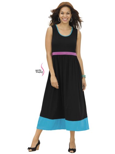 Our Gently Shaped Collection offers new options designed to complement your womanly proportions. We flatter your curves with beautiful styles created to follow your figure's contours. Classic black revved up with punches of color! Tank-style bodice with binding at the scoop neckline. Soft gathers fall below the waistband for a graceful look; skirt is bordered with a deep band of color. Shaped A-line fit. 100% cotton. Machine wash. Imported. Length: 51".