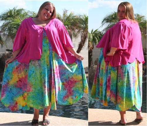 Our Petal Hemmed sleeveless sundress & jacket set is made of the softest cotton jersey knit in Batik fabric. This sundress has a low cut scoop neck both in the front and back. The strap is actually split into three separate straps. The generous hemline cut like a flower petal all the way around. The coordinating jacket has a single tie in the front and sleeves which drape over your arms. The seam meets under the arm at the armpit making it comfortable for all shapes and sizes. The matching hemline is the same as that of the dress. BBW Boutique's sizing is based first on BUST SIZE: 1X - 48-50"; 2X - 52-54"; 3X- 56-58"; 4X - 60-62"; 5X - 64-66"; 6X - 68-70"; 7X - 72-74"; 8X 76-78" In order for a great fit, please follow these measuring guidelines prior to placing your order: First, use a top or dress from your own closet for which the fit is perfect for you. Lay your top or dress out flat. Measure loosely across from armpit to armpit and double that measurement. This is your "Bust" measurement. If you are taking your actual bust measurement instead of measuring a garment, we generally recommend that you add 4" to your actual measurement. For example, if your bust measures around 50", you add 4" which would place your bust at 54". 8" below your bust measurement is your "waist". 9" below your waist measurement is your hips; or 17" from your armpit is your "hip" measurement. We provide you with approximate measurements of our items which you should look at before ordering your item. Again, we cannot stress enough that you order based on measuring, not on what you normally purchase from other clothing merchants. Please email us if you have sizing questions.