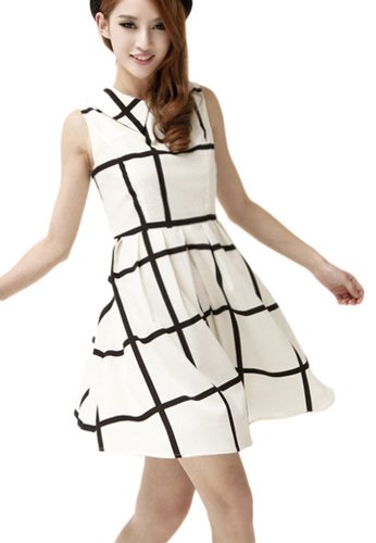 Chendvol Stripes Tartan Plaid Sleeveless Lapel Dress for Women (Medium, White Black)