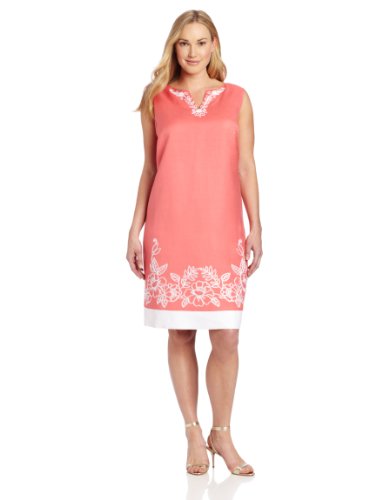 Jessica Howard Women's Sleeveless Embroidered Split Neck Plus Shift Dress, Coral, 16