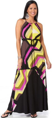 A long flowing maxi dress by London Times features a halter neckline with keyhole detail & colorful geometric print. This maxi dress is fashionable for both casual and career wear. Polyester/Spandex.