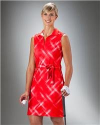 92% polyester / 8% spandex printed jersey Desert Dry? moisture wicking golf dress. Solid self collar with 2 button ?Y? neck. Snap in undershort, self belt and side hand pockets. Embroidered flame icon at back neck.ÿ