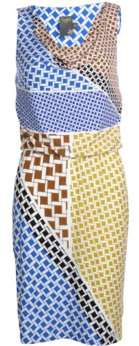 This contemporary dress by Taylor features partial lining, pull over style, cowl neck, blouson style top, elastic waist, sleeveless, sheath silhouette, jersey stretch fabric, and varying thatch style printed patterns in shades of blue, white, yellow, black, and tan.