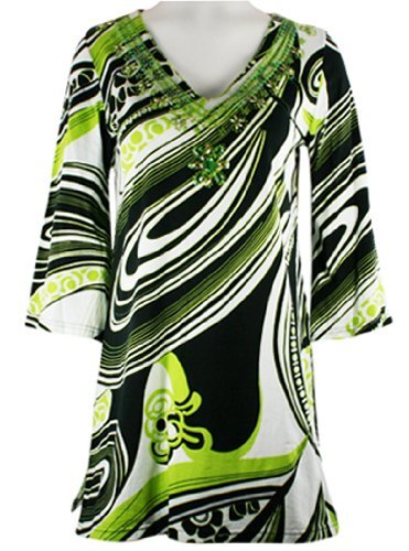 Joyous & Free Clothing - Cafe Artiste, Lime Colored Geometric Print, 3/4 Sleeve Womens Tunic Mini Dress with V-Neck Collar & Side Pleats