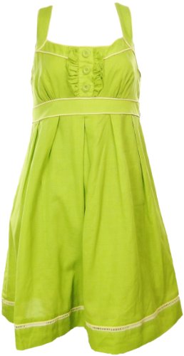 Jessica Simpson's Ruffle Front Tank Dress features full cotton lining, U-neck, wide adjustable straps, ruffled front trim with button detailing, elasticized back panel, empire waist, tie back sash, color contrast trim, paneled underbust, and lightly pleated skirt. 100% Cotton. Dry clean only. Made in Vietnam.