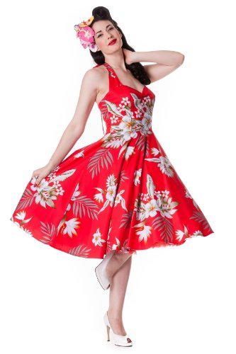 This gorgeous Hell Bunny 50's dress has a beautiful tropical floral pattern on a red dress. This halterneck dress comes in 5 different colours. The bodice is fitted and the back has an elasticated smocked panel either side of the zip to give a perfectly shug fit. The skirt is a full circle skirt and looks great with a ruffled petticoat. The model in the main image is wearing a Hell Bunny 25" Petticoat (sold separately) The main features of the Hell Bunny Red Alika Dress include;